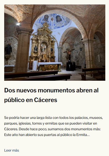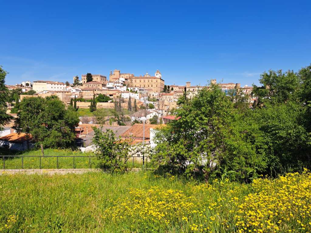 En uno de las zonas más altas de este barrio hay una pequeña explanada con árboles y césped, donde un sencillo cartel azul indica que hemos llegado al banco más bonito de Cáceres. No se trata de una gran obra de diseño: este asiento con respaldo encaja perfectamente en su entorno de barrio humilde, ya entrado en años. Pero eso sí, las vistas son de lujo: todos los palacios, iglesias y casas señoriales que hemos visto de cerca durante el paseo por el centro, los tenemos ahora delante de nosotros, en una sola imagen.