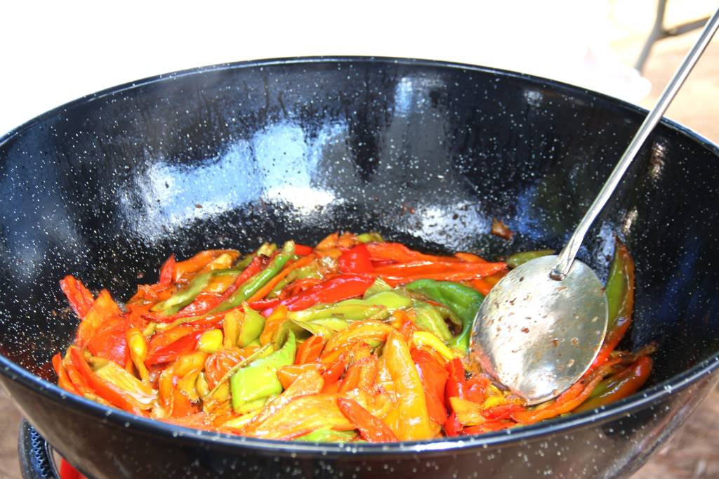 En una sartén sofreímos, a fuego lento con un poco de aceite, el tocino y el embutido hasta que se doren y suelten toda la grasa. Reservamos y hacemos lo mismo con el pimiento cortado en tiras finas. Por último sofreímos las migas de pan en el aceite que ya lleva todo el sabor de la carne y la verdura. Añadimos el resto de ingredientes preparados previamente. Mezclamos bien y servimos: solo, con huevo frito y/o con uvas.