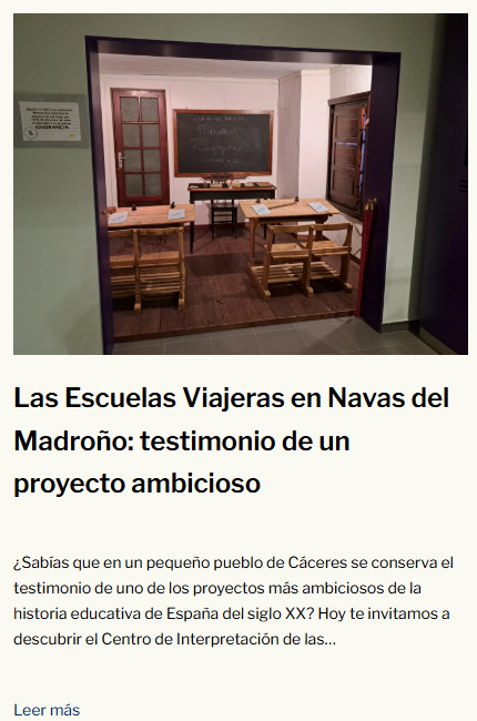 Unos años más tarde abre en Navas de Madroño el Centro de Interpretación de las Escuelas Viajeras para dar a conocer este descubrimiento y el ambioso proyecto de llevar cultura y educación a las zonas donde el analfabetismo superaba el 50% de la población.